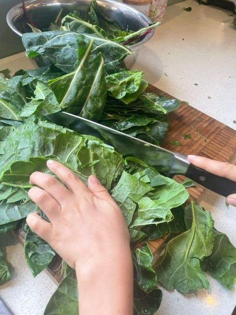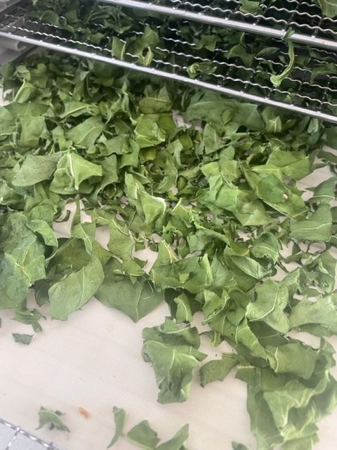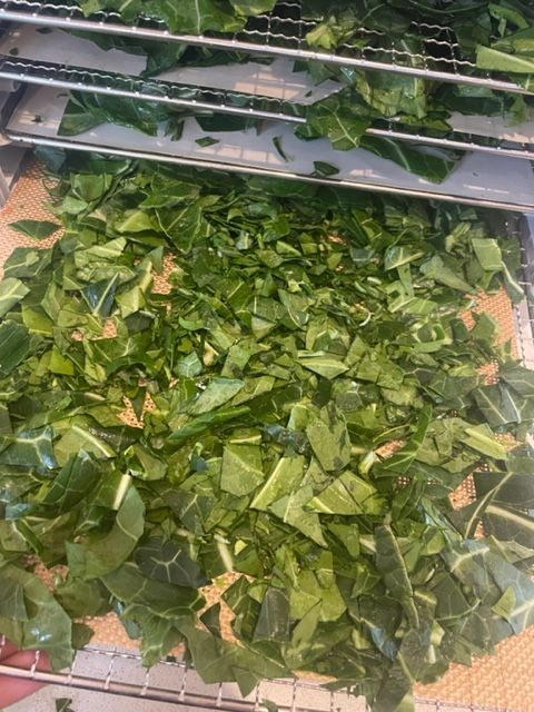 You could use any leafy greens and herbs; we used mainly collard greens because they are growing profusely to the point even the chickens cannot eat enough to keep up with production. If you grow medicinal herbs, you could even make your own blend suited to your needs. The thickness of your leaves will determine how long they need to be dehydrated for.